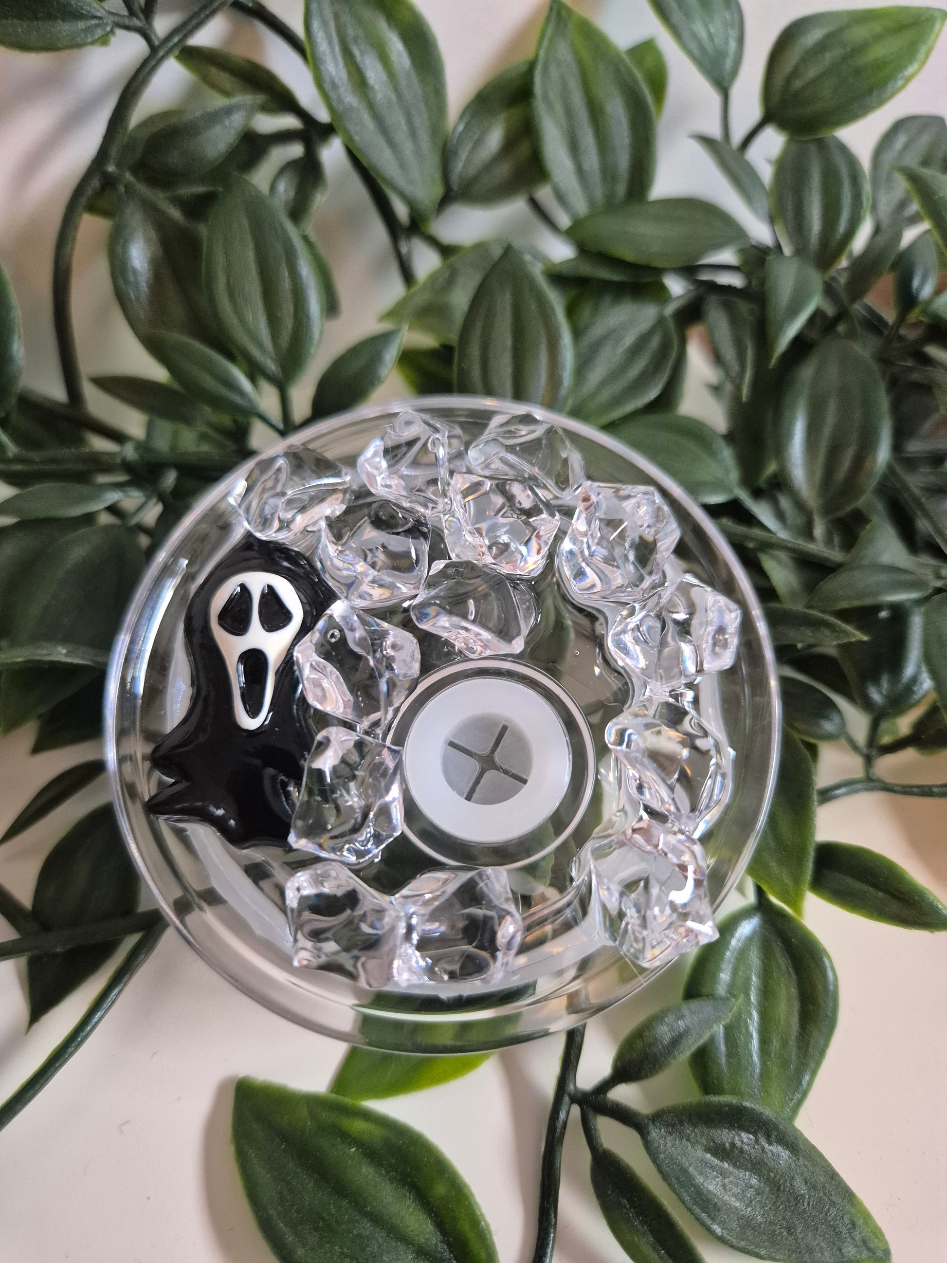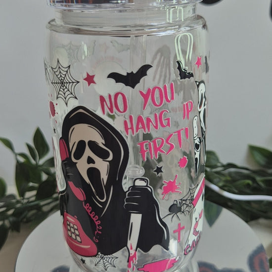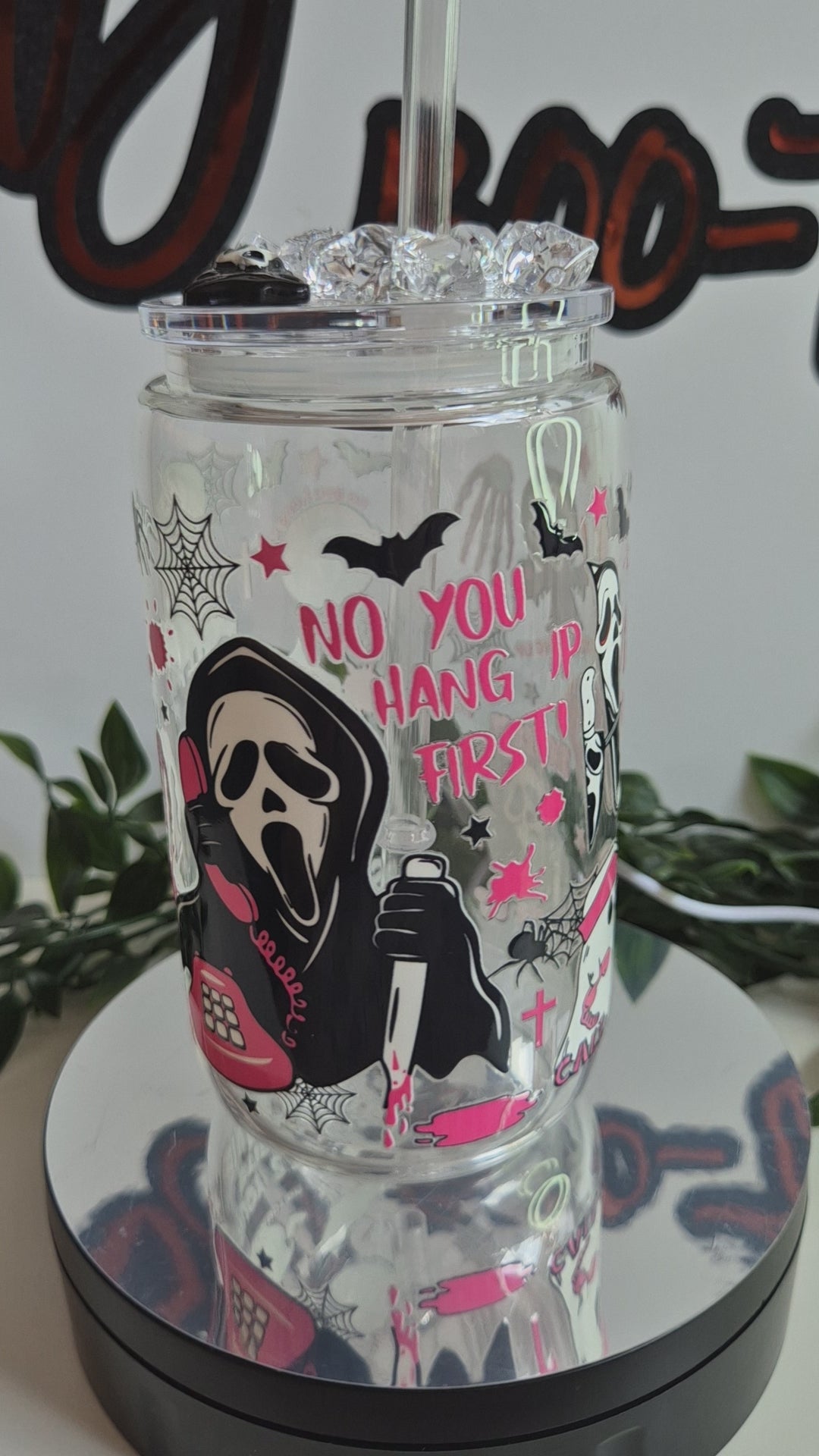 16oz glass Ghost Face Cup. Comes with detailed lid and straw.