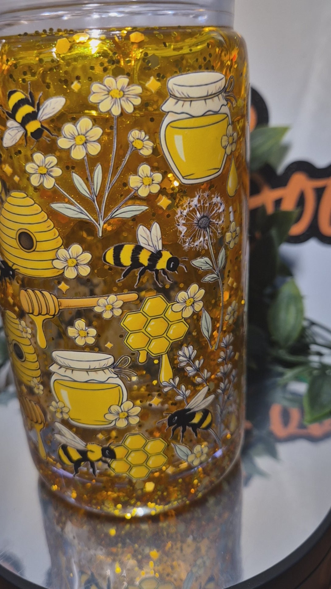 16oz acrylic Honey Bee Drip Libby Cup. Comes with detailed lid and straw.